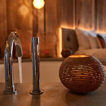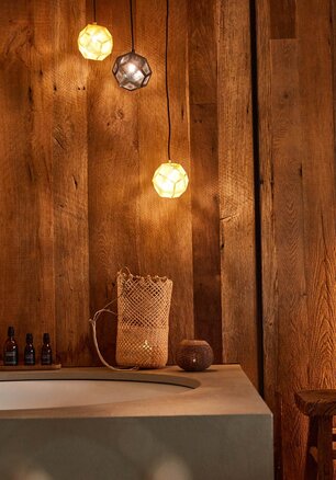 Barfuß die Struktur des Holzbodens fühlen, sich von der Wärme der finnischen Sauna durchfluten lassen und in ein Meer aus Erholung eintauchen, in der runden Badewanne. Große Gefühle im stilsicheren Mix aus Naturmaterial und Ethno-Design.