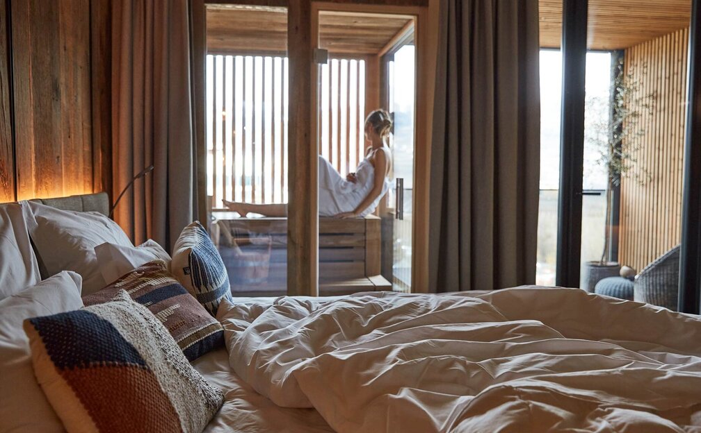 Wellness Suite, 44 m². Eine Oase der Ruhe mit dem Luxus exklusiver Privatsphäre. Eine Synergie aus Naturmaterialien und ausgesuchtem Ethno-Style.