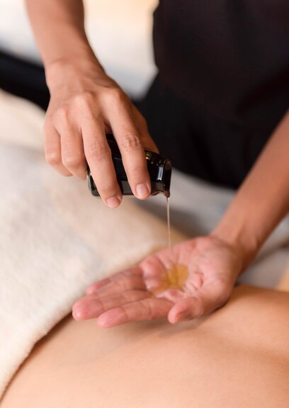Bei der Aromaölmassage werden ätherische Öle in Verbindung mit einem Basisöl sanft in die Haut einmassiert. Hochwertige Öle aus rein pflanzlichen Blüten-, Frucht-, Blatt und Wurzelextrakten ermöglichn, dank ihrer außergewöhnlichen Wirkstoffe, effektive Wirkung auf den gesamten Organismus. Ein Kraftspender für alle Sinne.