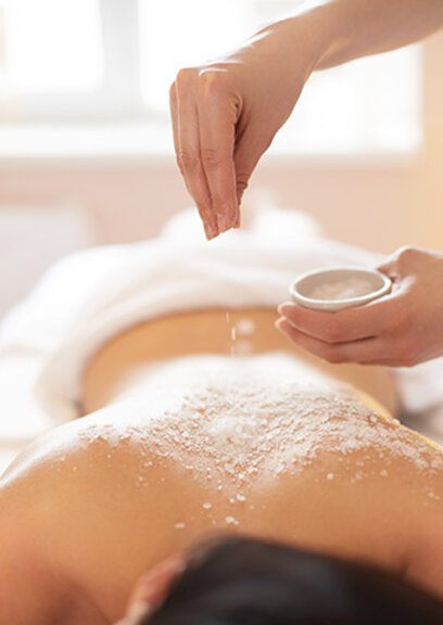 Dieses Peeling bewirkt die Selbstfettung und Reinigung der Haut und schenkt Geschmeidigkeit in Vollendung. Spüren Sie die besondere Wertigkeit, der in feinster Weise gemahlenen enthaltenen Edelsteine. Außerdem wird der Fettstoffwechsel angekurbelt. Nach dem Peeling dürfen Sie sich abduschen. Anschließend werden Sie an Händen und Füßen massiert. Das Ergebnis ist ein Hautgefühl wie Samt und Seide.